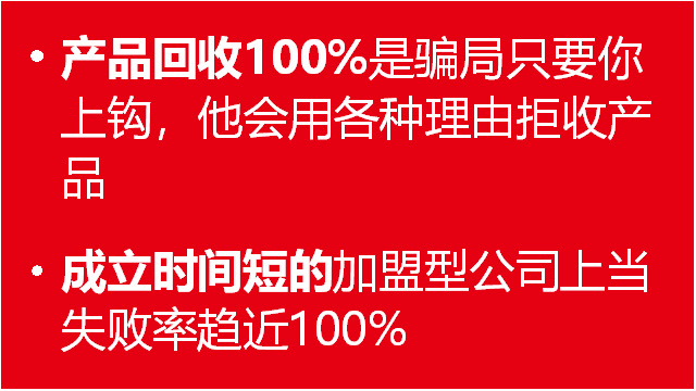 十三、項(xiàng)目加盟騙局大都會(huì)利用人們對(duì)電視廣告宣傳的傳統(tǒng)認(rèn)可心里,殊不知現(xiàn)在的常規(guī)電視廣告不到2萬元,就可以同時(shí)在央視七套等省級(jí)衛(wèi)視多個(gè)電視臺(tái)同時(shí)播放45次5秒鐘的廣告,由于廣告部門受利益驅(qū)使對(duì)項(xiàng)目合格性合法性審核不嚴(yán)的原因,只要出示營業(yè)執(zhí)照同時(shí)交錢就可以打廣告,所以,越來越多的創(chuàng)業(yè)者因?yàn)槠烹娨晱V告而上當(dāng)受騙;
