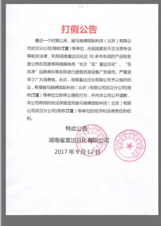 最近一個(gè)時(shí)期以來(lái),以駿馬馳騁國(guó)際科技(北京)有限公司武漢分公司(簡(jiǎn)稱汀渲)為代表等單位,無(wú)視國(guó)家反不正當(dāng)競(jìng)爭(zhēng)法等相關(guān)法律,利用湖南富達(dá)日化近30多年形成的產(chǎn)品知名度公然在百度等網(wǎng)絡(luò)媒體用“長(zhǎng)沙“及”富達(dá)日化”、“生態(tài)凈”品牌商標(biāo)等名稱進(jìn)行虛假洗滌設(shè)備廣告宣傳。嚴(yán)重誤導(dǎo)了廣大消費(fèi)者。在此,湖南富達(dá)日化有限公司予以強(qiáng)烈抗議,希望駿馬馳騁國(guó)際科技(北京)有限公司武漢分公司(簡(jiǎn)稱汀渲)等單位立即停止侵權(quán)行為,并向本公司公開(kāi)道歉,本公司將同時(shí)依法保留追究駿馬馳騁國(guó)際科技(北京)有限公司武漢分公司(簡(jiǎn)稱汀渲)等單位的經(jīng)濟(jì)和法律責(zé)任的權(quán)利。