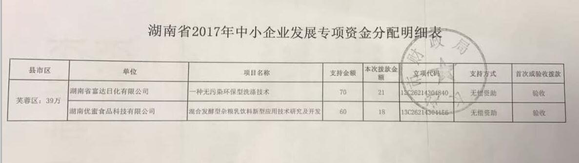 多項專利發(fā)明人王先軍 手機:150-7483-5702 手機:195-7316-02882017年7月26日,根據(jù)湖南省財政廳關于下達2017年中央財政中小企業(yè)發(fā)展專項資金的通知》(湘財教指【2017】31號),將中央財政中小企業(yè)發(fā)展專項資金予以下達。由長沙市財政局和長沙市科學技術局共同簽發(fā)文件,將相關款項如數(shù)劃撥到項目承接單位。湖南省富達日化有限公司申報的項目“ 一種無污染環(huán)保洗滌技術”由中央財政無償資助項目項目驗收款21萬元。截止2017年11月,湖南省富達日化有限公司再次獲得中央財政無償項目資金支持。