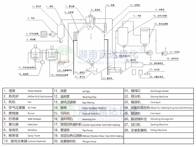 干燥塔(干燥塔體、塔承載加強(qiáng)圈、骨架、熱風(fēng)分布器、人孔檢修門、出風(fēng)管及清洗人孔、錐體氣錘、主塔支撐鋼架、進(jìn)塔熱風(fēng)管道、變徑連接管道、保溫材料、伴熱攪拌罐、電加熱、過濾器)、熱源系統(tǒng)(燃?xì)鉄犸L(fēng)爐)、鼓風(fēng)機(jī)(鼓風(fēng)機(jī)、初/中效空氣過濾器)、進(jìn)料泵、噴槍、高效旋風(fēng)分離器(高效旋風(fēng)分離器、旋風(fēng)出料閥、緩存料倉(cāng))、除塵系統(tǒng)(管道、布袋除塵器)、引風(fēng)機(jī)、控制系統(tǒng)(控制柜、變頻器、溫度傳感器、壓力傳感器)、輔助系統(tǒng)(欄桿、扶梯、現(xiàn)場(chǎng)電線電纜橋架、現(xiàn)場(chǎng)鋼架結(jié)構(gòu)平臺(tái)) |