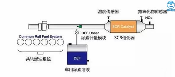 SCR系統(tǒng)包括尿素罐(裝車用尿素溶液)、SCR催化反應(yīng)罐。SCR系統(tǒng)的運(yùn)行過程是:當(dāng)發(fā)現(xiàn)排氣管中有氮氧化物時(shí),尿素罐自動(dòng)噴出車用尿素溶液,尿素溶液和氮氧化物在SCR催化反應(yīng)罐中發(fā)生氧化還原反應(yīng),生成無污染的氮?dú)夂退魵馀懦觥?/span>