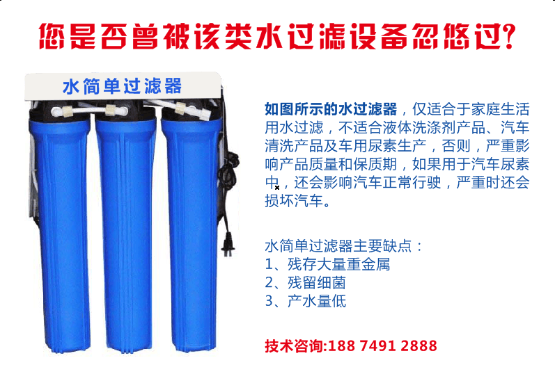 多項專利發(fā)明人王先軍 手機:150-7483-5702 手機:195-7316-0288水處理品種繁多,有如圖所示的簡單過濾式,也有正規(guī)反滲透水處理設(shè)備,前者只能過濾水中的常規(guī)雜質(zhì),后者可以去除水中的重金屬離子,還可以殺滅水中的大腸桿菌、芽孢菌。綠農(nóng)桿菌等細(xì)菌,從而提高產(chǎn)品去污力,延長產(chǎn)品保質(zhì)期,前者簡單水過濾設(shè)備只適合散裝大桶洗滌劑生產(chǎn),后者水處理形成的去離子水可以生產(chǎn)保質(zhì)期長的瓶裝洗滌產(chǎn)品。